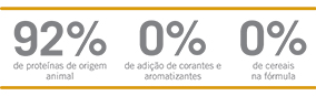 Humedad (máx.) 9%; Proteína Bruta (mín.) 25%; Extracto Etéreo (mín.) 12%; Materia Fibrosa (máx.) 1,9%; Materia Mineral (máx.) 7,5%; Calcio (mín.) 0,8%; Calcio (máx.) 1,5%; Fósforo (mín.) 0,6%; Sodio (mín.) 5.000mg/ kg; Potasio (mín.) 9.000mg/kg; Magnesio (mín.) 800mg/kg; Omega 6 (mín.) 12g/kg; Omega 3 (mín.) 2.600mg/kg; DHA (mín.) 650mg/kg; EPA (mín.) 550mg/kg; Fructo-Oligosacáridos (mín.) 6.000mg/kg; Manano-Oligosacáridos (mín.) 400mg/kg; Metionina (mín.) 5.000mg/kg; Taurina (mín.) 1.000mg/kg; L-Carnitina (mín.) 200mg/kg; Sulfato de Condroitina (mín.) 900mg/kg; Sulfato de Glucosamina (mín.) 1.200mg/kg; E. Metabolizable (mín.) 3.895 kcal/kg.